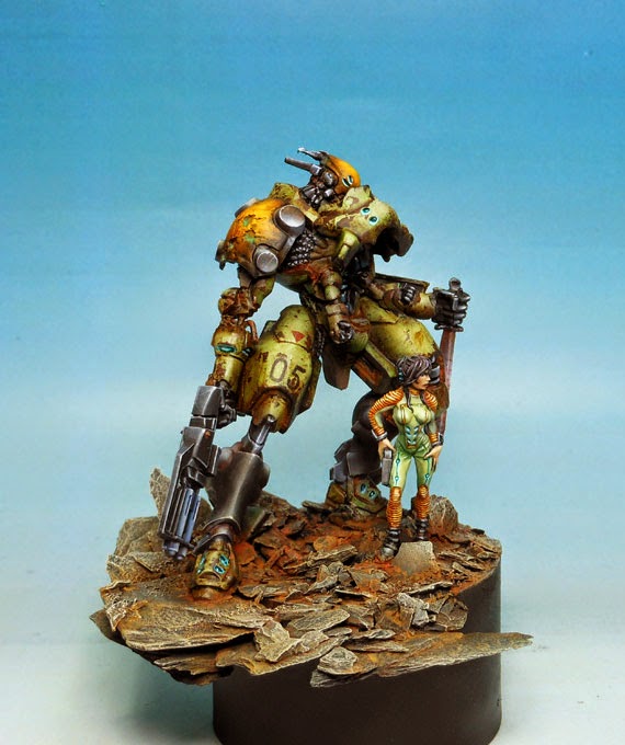 MNM Vert armure Mercenaire, Freehand chiffres, Weathering, MNM Orange, Freehand étoile, MNM Gris, Effet arme rouillée, MNM Noir, Vêtement Orange, Peau Européenne commune, LED Bleu-Vert Clair, Socle rocheux, Effet de sang, Effet de salissures