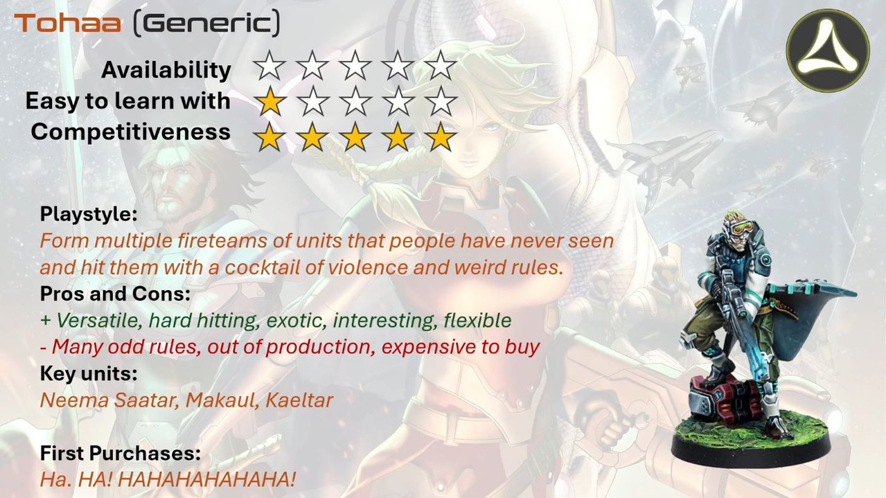 1. **Complexité** : Tohaa est une faction difficile à maîtriser pour les débutants en raison de ses mécanismes uniques.