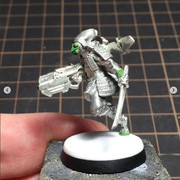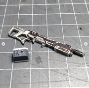 Les modifications incluent : repositionner la jambe droite pour rendre sa pose plus dynamique ; repositionner sa main droite pour rendre l'épée moins vulnérable et faciliter le rangement ; limant la tête et échangeant ses antennes pour aligner la forme avec celle de mon autre Druze personnalisé ; construire un fourreau pour son porte-porte blindée ; et en ajoutant un tambour de munitions à son Mk12 pour mieux représenter le +1 Burst (swivez pour voir des photos du tambour avant qu'il ne soit fixé au modèle).